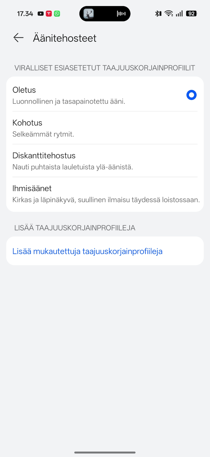 Kuulokkeiden sovelluksen äänitehosteet osiossa saatavista taajuuskorjainprofiileista Kohotus-asetus lisää kuulokkeiden bassokorostusta, mutta käytännössä tämä ei kuulokkeiden äänenlaatua paranna. Korotus vain korostaa jo ennestään kuuluvia korkeampia bassoja ja tekee äänestä muovisen kumisevaa, minkä myötä vakioääni jää selvästi laadukkaammaksi. Tarjolla on myös 10-kanavainen vapaa taajuuskorjain, mutta ei sekään rakenteen rajoitteita korvaa ainakaan itselleni.