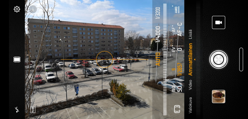 Manuaalitila löytyy kuvaustilalistasta ”Ammattilainen”-nimellä ja on säädöiltään vastaava esimerkiksi Mate 10 Pron tai edeltäjämalli P10:n kanssa. Kuvausnäkymän oikeaan reunaan avautuu manuaalisäädöt tarkennukselle, ISO-arvolle (50 – 3200), suljinajalle (1/4000 – 30 sekuntia), valotuksen kompensoinnille ja mittaukselle sekä valkotasapainolle. Pro-tilassa myös RAW-kuvaus on mahdollista kytkeä päälle, jolloin kamera tallentaa tilanteesta sekä raakakuvan että JPG-kuvan.