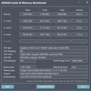 AIDAn Memory Benchmark -testissä näkyy Asuksen päätös käyttää vain yhtä muistikampaa ja muistikanavaa lähes puolet alhaisempana muistiväylän kaistanleveytenä HP:een ja Lenovoon verrattuna.