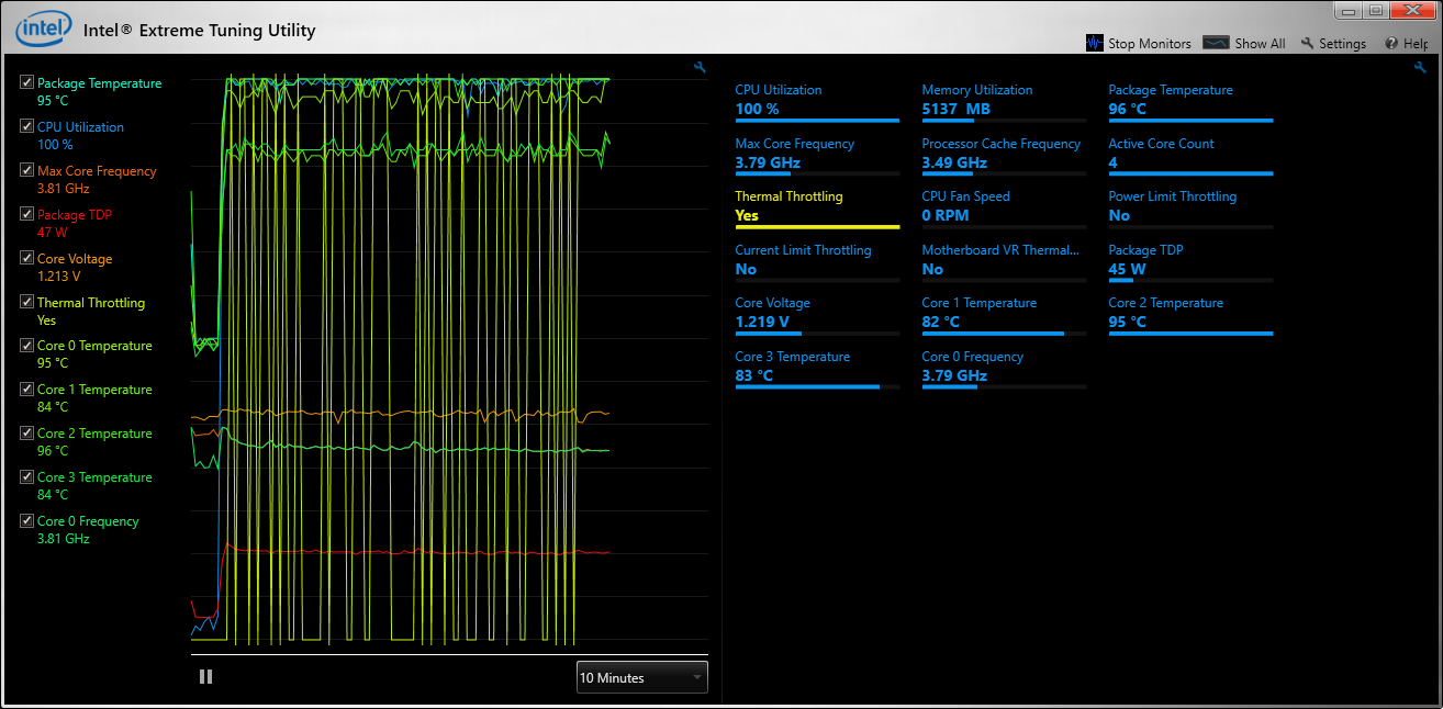 Ajelin testejä omalla HP Omen -läppärillä (i7-6700HQ) käyttämällä tuota Intel XTU:ta ja Prime95:ttä.