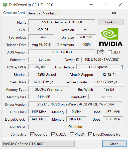 GeForce GTX 1060:ssä on GP104-grafiikkapiirin sijaan GP106, jossa on käytössä 1280 CUDA-ydintä ja kuusi gigatavua 8 Gbps siirtonopeudella toimivaa GDDR5-näyttömuistia 192-bittisen muistiväylän jatkeena. Käytössä on kaksi muistikanavaa eli kaksi DDR-2400-nopeudella toimivaa 8 gigatavun DDR4-muistikampa.
