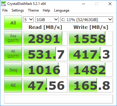 CrystalDiskMarkin ROG G701VIK oli perättäisissä luku- ja kirjoitustesteissä 512 gigatavun SSD RAID 0 -konfiguraatiollaan selvästi kolmikon suorituskykyisin. Lenovon 256 gigatavun SSD oli lukunopeudelta nopeampi kuin HP ja HP:n 512 gigatavun SSD puolestaan kirjoitusnopeudelta nopeampi kuin Lenovo.