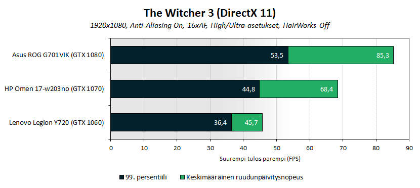 Myös The Witcher 3:ssa Asus ja HP pyörittivät peliä sulavasti High/Ultra-asetuksilla, mutta Lenovolla on suositeltavaa käyttää korkeintaan High-asetuksia.