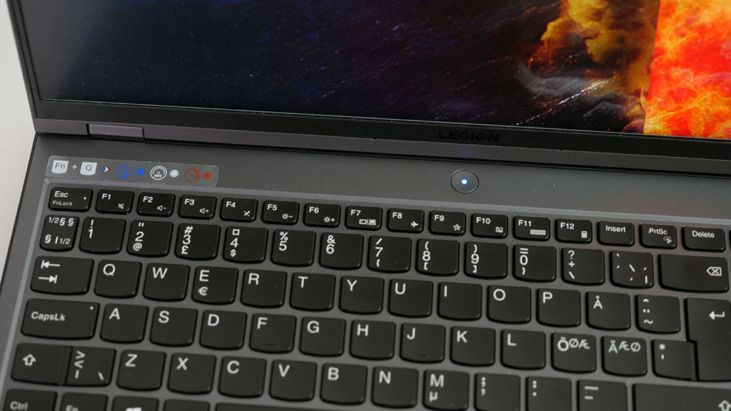 Legion 5 Pron näppäimistö on täysikokoinen ja tuntumaltaan perinteinen kannettavan näppäimistö. Kyseisen mallin näppäimistö on taustavalaistu RGB:n sijaan valkoisin ledein ja pyörä virtapainike sijaitsee näppäimistön yläpuolella. Kosketuslevy on tuntumaltaan hyvin perinteinen. Virtapainikkeen valo vaihtuu kätevästi valitun suorituskykyprofiilin mukaan (sininen-valkoinen-punainen). Profiilia vaihdeltaessa virtapainikkeen valon väri on ainoa indikaatio käytössä olevasta profiilista, jollei avaa Lenovon omaa hallintasovellusta.