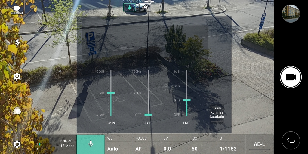 Kuvanlaadullisesti G6:n 4K-video on kamerapuhelinten parempaa päätä. Kuva on terävää ja värintoistoltaan eläväistä. 1080p-videon laatu on puolestaan hyvää perustasoa ja 60 FPS:n tilassa liiketoisto sulavoituu havaittavasti, mutta samalla kuvan yksityiskohdat myös pehmenevät jonkin verran. Melko ronskia tärinää tuottavassa polkupyörällä tehdyssä kuvanvakaintestivideossa voi havaita, kuinka tärinä ja vakautus aiheuttavat kuvaan tyypillistä näkyvää pystysuuntaista aaltoilua. Emme valitettavasti ehtineet testijakson aikana taltioimaan mallivideota äänekkäässä ympäristössä, mutta testasimme mikrofonien toimintaa keinotekoisin konstein ja totesimme niiden tallentavan huomattavasti yleistä tasoa paremmin kovia äänenvoimakkuuksia.