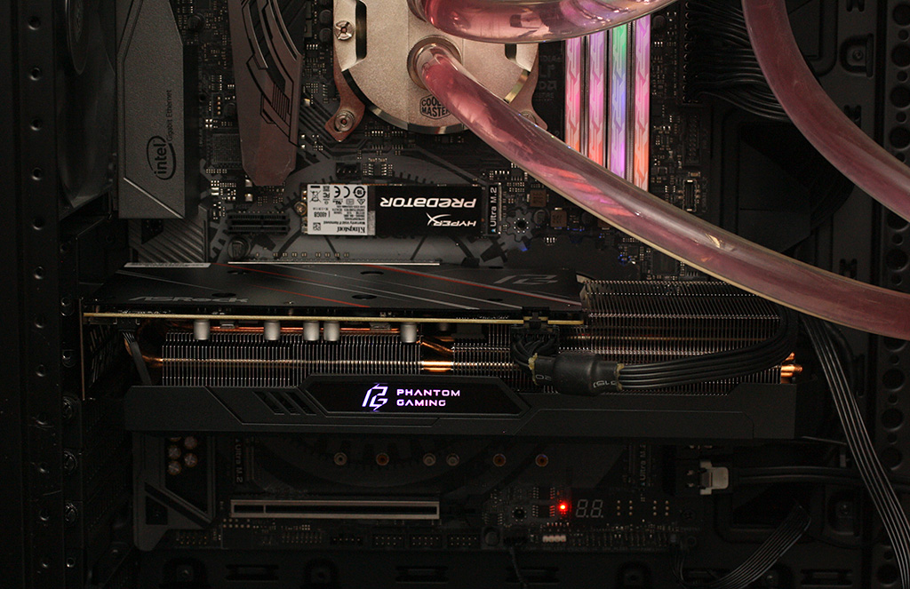 Näytönohjainten testikokoonpano on kasattu Cooler Masterin Cosmos C700P -kotelon sisälle, jonka etupaneelissa kaksi 140 mm:n kotelotuuletinta imee viileää ilmaa kotelon sisuksiin ja takapaneelissa yksi 140 mm:n tuuletin puhaltaa lämmintä ilmaa ulos. Testikokoonpanona toimi vesijäähdytetty Intelin 6-ytiminen Core i7-8700K -prosessori asennettuna ASRockin Z370 Taichi -emolevylle ja 16 gigatavua DDR4-3200-nopeudella toimivaa keskusmuistia. Käyttöjärjestelmänä on käytössä 64-bittinen Windows 10 Pro asennettuna Kingstonin 480 gigatavun M.2 SSD:lle. Kokoonpanon virransyötöstä vastaa Corsairin 1000 watin HX-virtalähde.