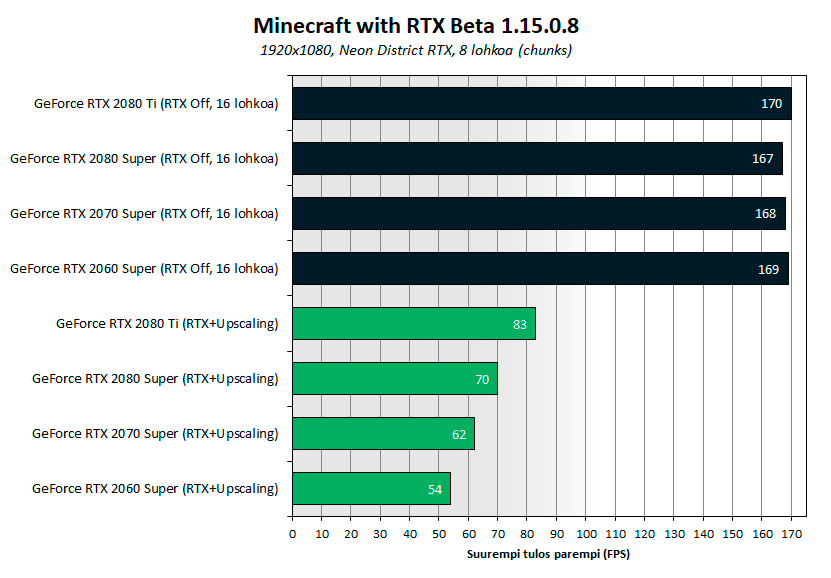 Toistaiseksi RTX-ominaisuutta tukevia pelejä on julkaistu vain kourallinen ja useimmissa on käytetty säteenseurantaa hyvin rajallisesti. Minecraftin kohdalla peli saadaan muunnettua säteenseurannan avulla todella paljon näyttävämmäksi ja ominaisuuden laaja-alainen käyttö sopii peliin todella hyvin. Upscaling eli DLSS 2.0 toimii niin suorituskyvyn kuin kuvanlaadun osalta erinomaisesti ja parantaa suorituskykyä niin kriittisesti, että sitä on käytännössä pakko käyttää. Full HD -resoluutiolla säteenseurannan käyttö onnistuu kaikilla GeForce RTX 20 -sarjan näytönohjaimilla, mutta 1440p-resoluutiolla ruudunpäivitysnopeudet tipahtavat jo alle 60 FPS:ään. 4k-resoluutioilla ainoastaan GeForce RTX 2080 Ti jaksaa renderöidä säteenseurantaa edes välttävästi.