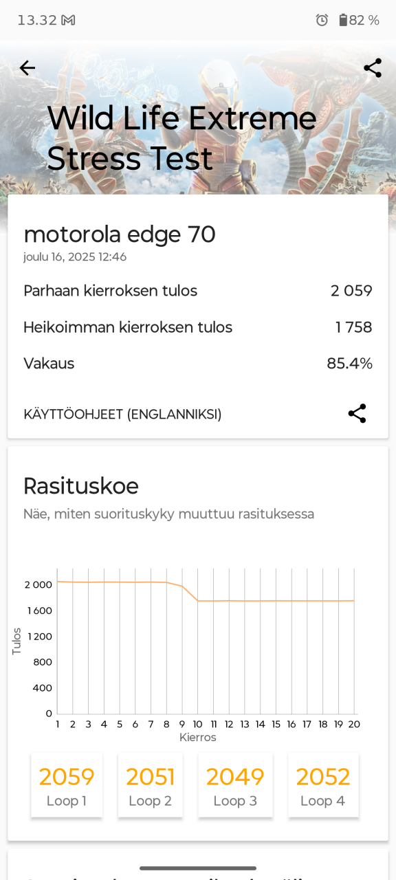 Edge 70:n Snapdragon 7 gen 4 -piirin suorituskyky jää kauas tämän hintaluokan puhelimien parhaimmistosta, kuten OnePlus 13R:stä ja Galaxy S25 FE:stä. Vaikka kyseessä onkin uunituore piirimalli, olisi se paremmin kotonaan edullisemmassa noin 400-500 euron hintaluokassa.