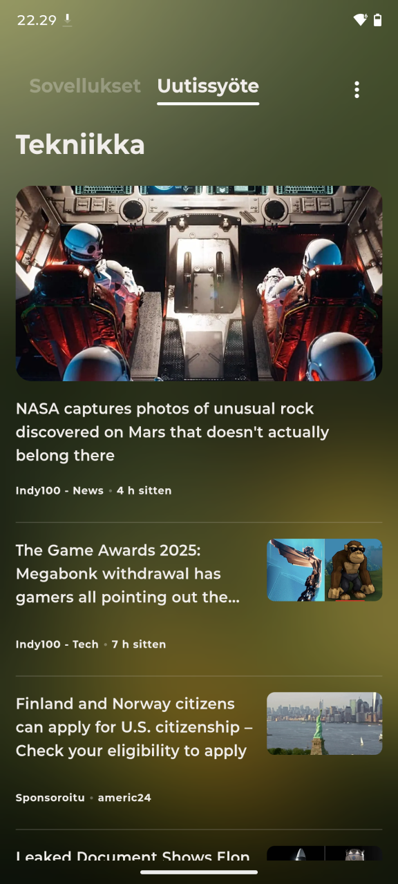 Sovellusvalikossa on käytössä uudet Smart Tabs -välilehdet, eli itse sovellusten ohella muilta sivusuunnassa pyyhkäisemällä avautuvalta välilehdiltä löytyy uutissyöte. Uutissyötteet on tarjolla vain englanniksi, eikä Suomea löydy lokalisointivaihtoehtojen joukosta.