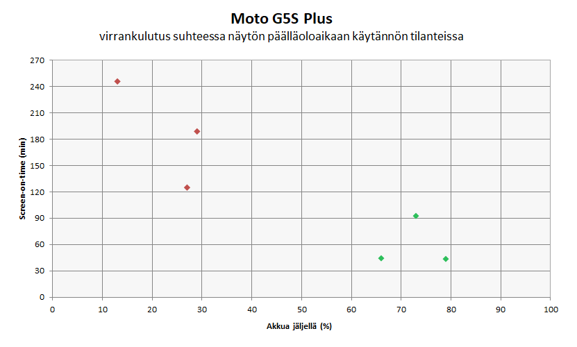 G5S Plussaa käytettiin ympärivuorokautisessa käyttötestissä hieman sisarmalliaan lyhyemmän aikaa, mutta toisaalta jaksolle mahtui mm. reissaamista ulkomailla. Käytännön akunkesto osoittautui hyvin samankaltaiseksi G5S:n kanssa.