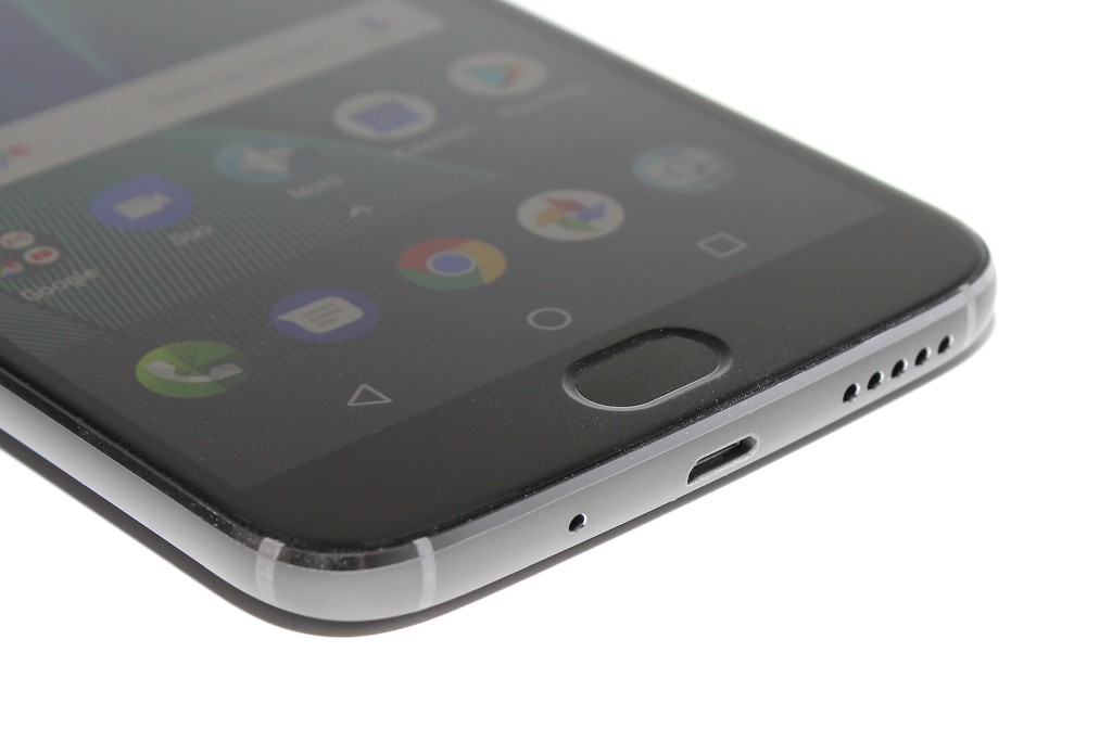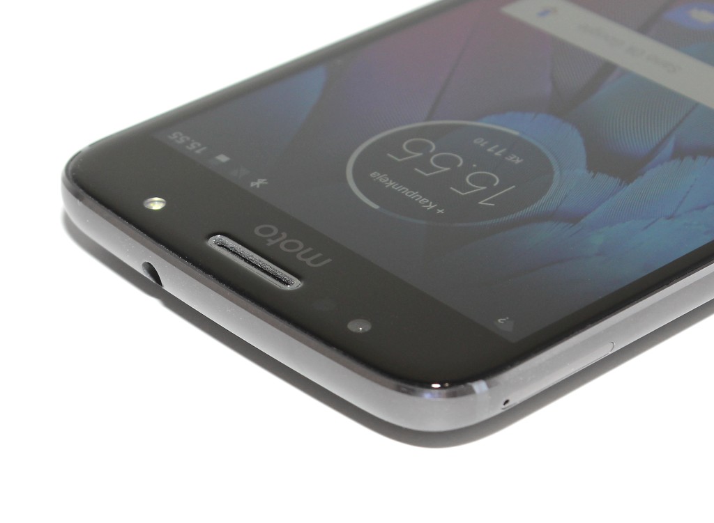 Moto G5S:n alapääty on nyt edeltäjämallin muovin sijaan metallia ja sinne on sijoitettu micro-USB-liitännän ohella myös äänenlaadultaan keskitasoinen kaiutin ja mikrofonin aukko. Näytön alapuolelta löytyy tuttu sormenjälkitunnistin, joka on upotettu hieman näyttölasin pinnan alapuolelle. Tunnistin toimii nopeasti ja luotettavasti ja se mahdollistaa myös näytön herättämisen ja sammuttamisen sekä navigointipainikkeet korvaavien pyyhkäisyeleiden käytön.
