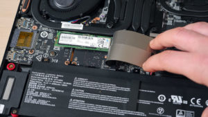 Pohjalevy on kiinni 13 ruuvilla, jotka avaamalla pääsee käsiksi laitteen sisuskaluihin. Testiin saapuneessa mallissa on kaksi M.2 SSD -liitintä, joista yksi on vapaana. Molemmat 16 gigatavun muistikammat ovat käyttäjän vaihdettavissa.