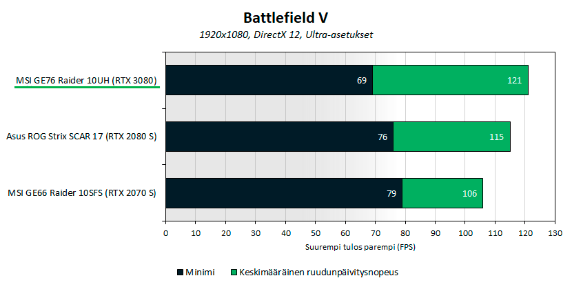 Battlefield V -pelissä Full HD -resoluutiolla ja parhailla Ultra-kuvanlaatuasetuksilla keskimääräinen ruudunpäivitysnopeus oli GeForce RTX 3080 Superilla varustetulla GE76 Raiderilla 121 FPS. Tulos on noin 5 prosenttia parempi kuin Asuksen Scar 17 -kannettavalla ja GeForce RTX 2080 Superilla ja noin 14 prosenttia parempi kuin GE66 Raiderilla ja GeForce RTX 2070 Superilla. GE76 Raiderin minimi jäi vertailun alhaisimmaksi todennäköisesti heikomman prosessorinsa johdosta.