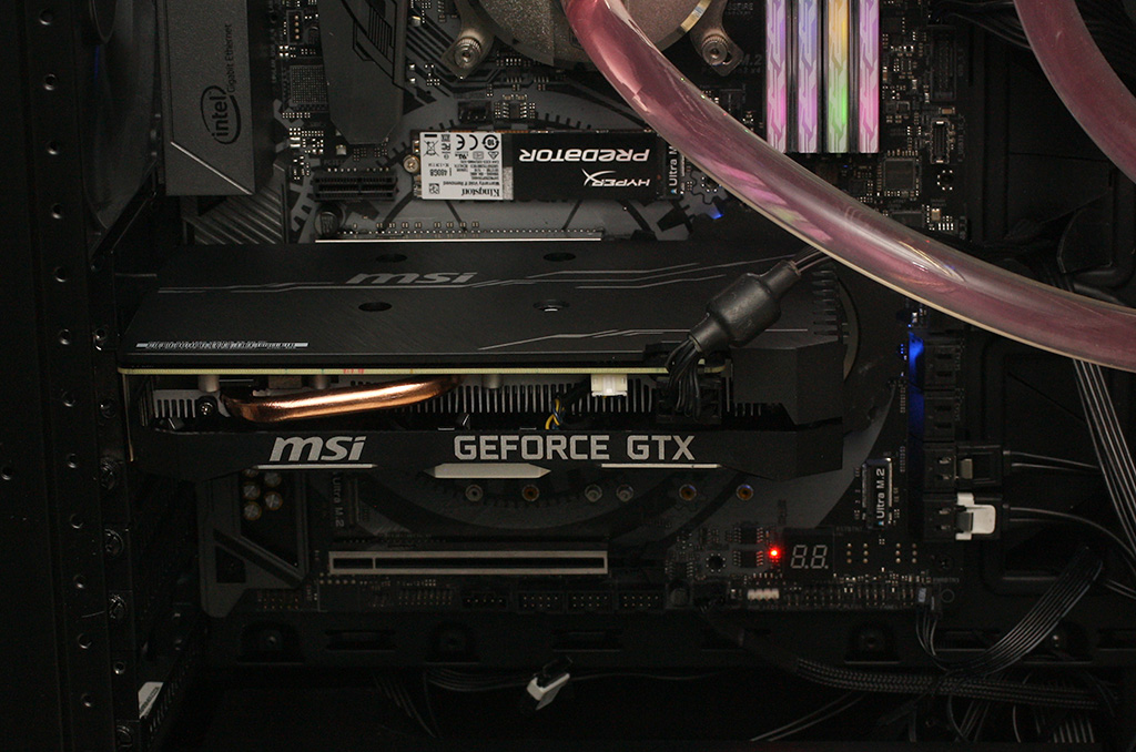 Näytönohjainten testikokoonpano on kasattu Cooler Masterin Cosmos C700P -kotelon sisälle, jonka etupaneelissa kaksi 140 mm:n kotelotuuletinta imee viileää ilmaa kotelon sisuksiin ja takapaneelissa yksi 140 mm:n tuuletin puhaltaa lämmintä ilmaa ulos. Testikokoonpanona toimi vesijäähdytetty Intelin 6-ytiminen Core i7-8700K -prosessori asennettuna ASRockin Z370 Taichi -emolevylle ja 16 gigatavua DDR4-3200-nopeudella toimivaa keskusmuistia. Käyttöjärjestelmänä on käytössä 64-bittinen Windows 10 Pro asennettuna Kingstonin 480 gigatavun M.2 SSD:lle. Kokoonpanon virransyötöstä vastaa Corsairin 1000 watin HX-virtalähde.