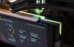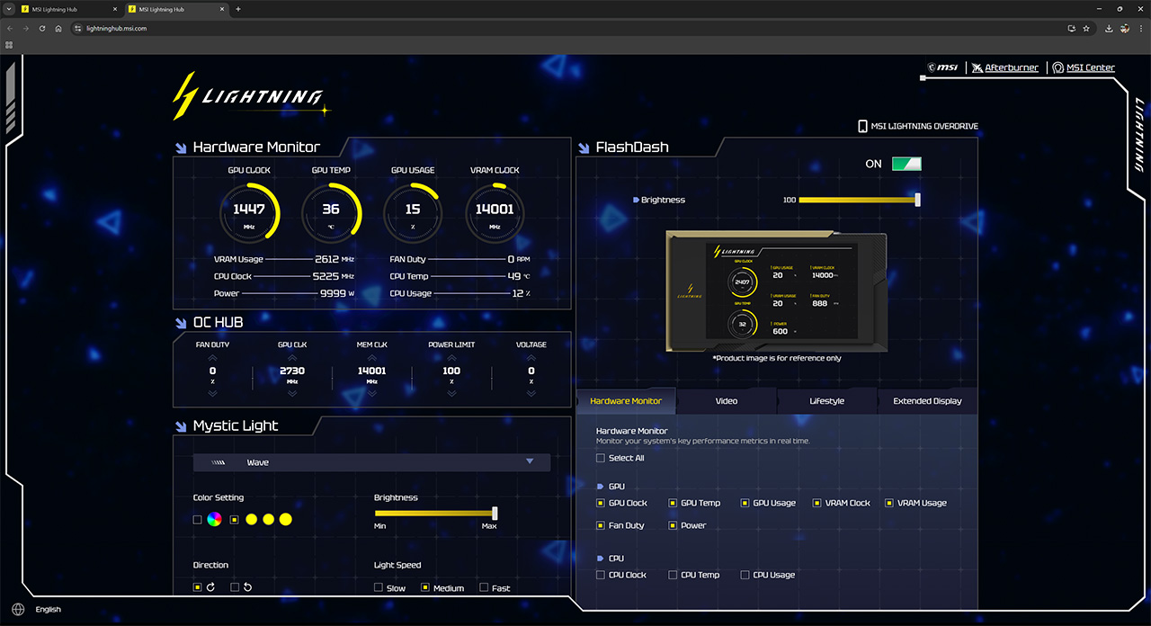 Ohjelmistopuolella näytönohjaimeen upotettua 8-tuumaista LCD-näyttöä ohjataan Windows Storesta asennettavan MSI Lightning Hub -sovelluksen kautta, joka uudelleenohjaa MSI:n kotisivuille erilliseen nettipohjaiseen ohjauspaneeliin.