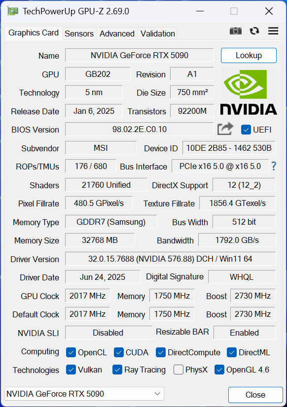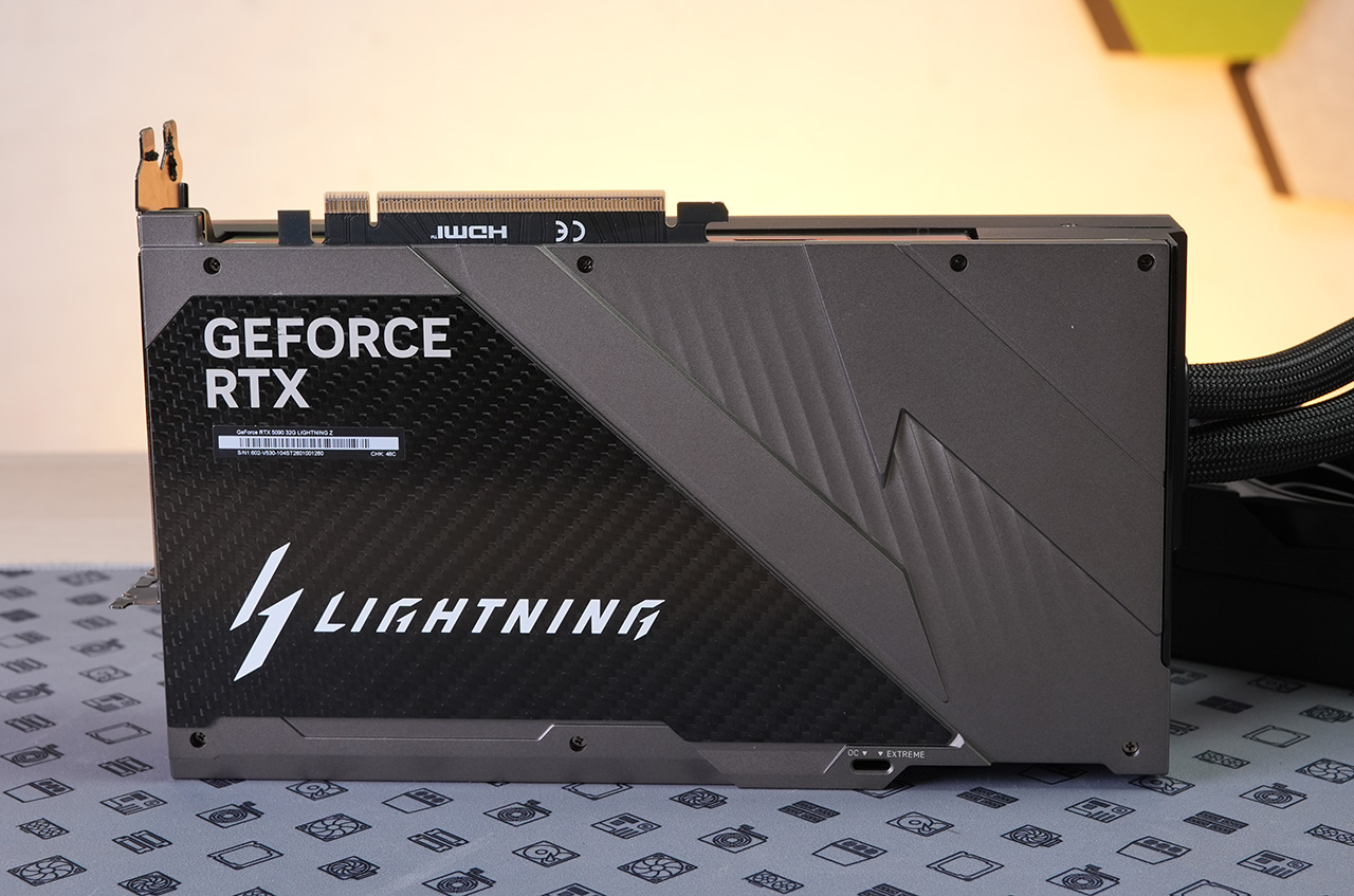 Grafiikkapiirin todellinen keskimääräinen kellotaajuus 4k-resoluutiolla ja säteenseuranta käytössä Cyberpunk 2077 -pelissä oli 5090 Lightning Z:lla vakiona 3002 MHz eli noin 30 MHz alhaisempi kuin Asuksen 5090 Matrixilla, mutta noin 320 MHz korkeampi kuin NVIDIA 5090 Founders Editionilla. GDDR7-muistit toimivat kaikilla näytönohjaimilla vakiona 28 Gbps nopeudella (GPU-Z: 1750 MHz).