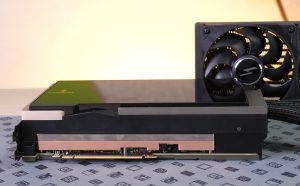 Näytönohjaimesta lähtee 45 cm pitkät letkut 360 millimetrin jäähdyttimeen ja letkujen punoksen sisään on integroitu siististi jäähdyttimen tuulettimien virtakaapelit. Jäähdytin on varustettu kolmella mustalla 120 mm:n tuulettimella, eikä niissä ole RGB-valoja. Grafiikkapiirin, muistien ja virransyötön päällä on lähes koko piirilevyn peittävä kuparista valmistettu kylmälevy.