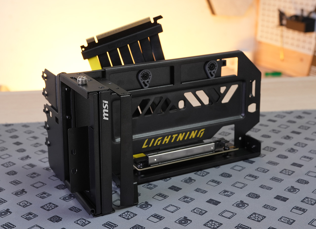 Myyntipakkauksen mukana toimitetaan koteloon asennettavaksi kehikko PCI Express 5.0 -riser-kaapelilla. Kehikossa näytönohjaimen sijaintia pystyy säätämään syvyys ja pituussuunnassa.