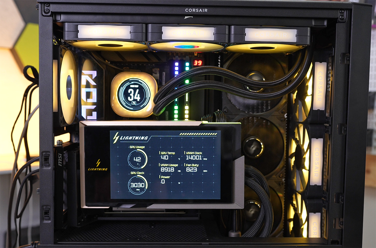 MSI 5090 Lightning Z erottuu joukosta näyttävällä leijuvalla pystyasennuksella, isokokoisella 8-tuumaisella näytöllä, erittäin järeällä virransyötöllä, kahdella 12V-2×6-virtaliittimellä ja nestejäähdytyksellä. Näyttö on yllättävän iso ja siististi integroitu näytönohjaimen kylkeen, mutta sen ohjelmistopuoli jätti toivomisen varaa toiminnallaan ja niukkuudellaan. Vaikka Extreme-tilassa 5090 Lightning Z:lle tarjolla on jopa 1000 watin tehonkulutus, se ei tuntunut saavan siitä yhtä hyvin tehoja irti kuin Asuksen 5090 Matrix omasta 800 watin rajoituksestaan. Asus porskuttikin testeissä suorituskyvyllä edellä niin vakiona kuin ylikellottuna, jossa se venyi huomattavasti korkeammille muistitaajuuksille.