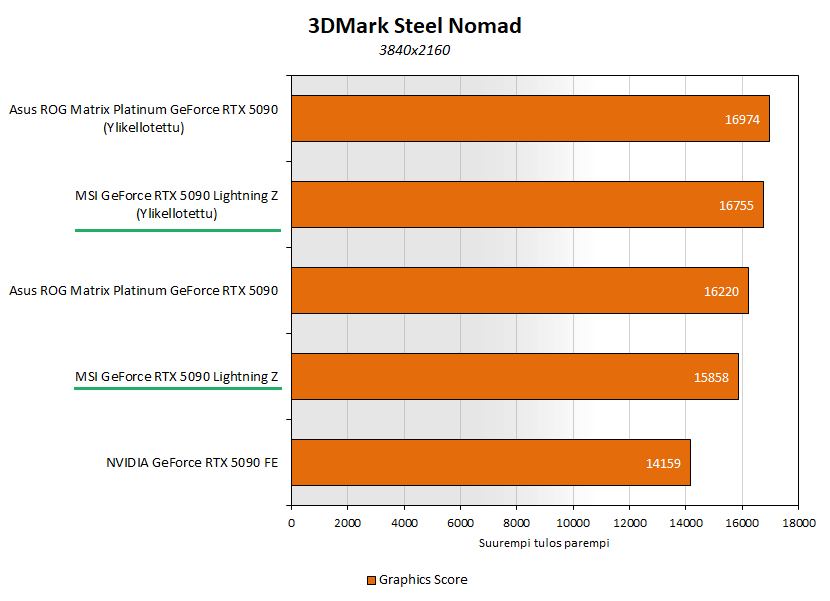 3DMark Steel Nomad -grafiikkatestissä Asuksen 5090 Platinum Matrix oli vakiona 2 % suorituskykyisempi kuin MSI:n 5090 Lightning Z, joka puolestaan oli noin 12 % suorituskykyisempi kuin 5090 Founders Edition. Ylikellotettuna 5090 Lightning Z:sta saatiin puristettua irti vielä 3 % parempi suorituskyky, mutta se hävisi Asuksen ylikellotetulle 5090 Matrixille noin 5 % erolla.