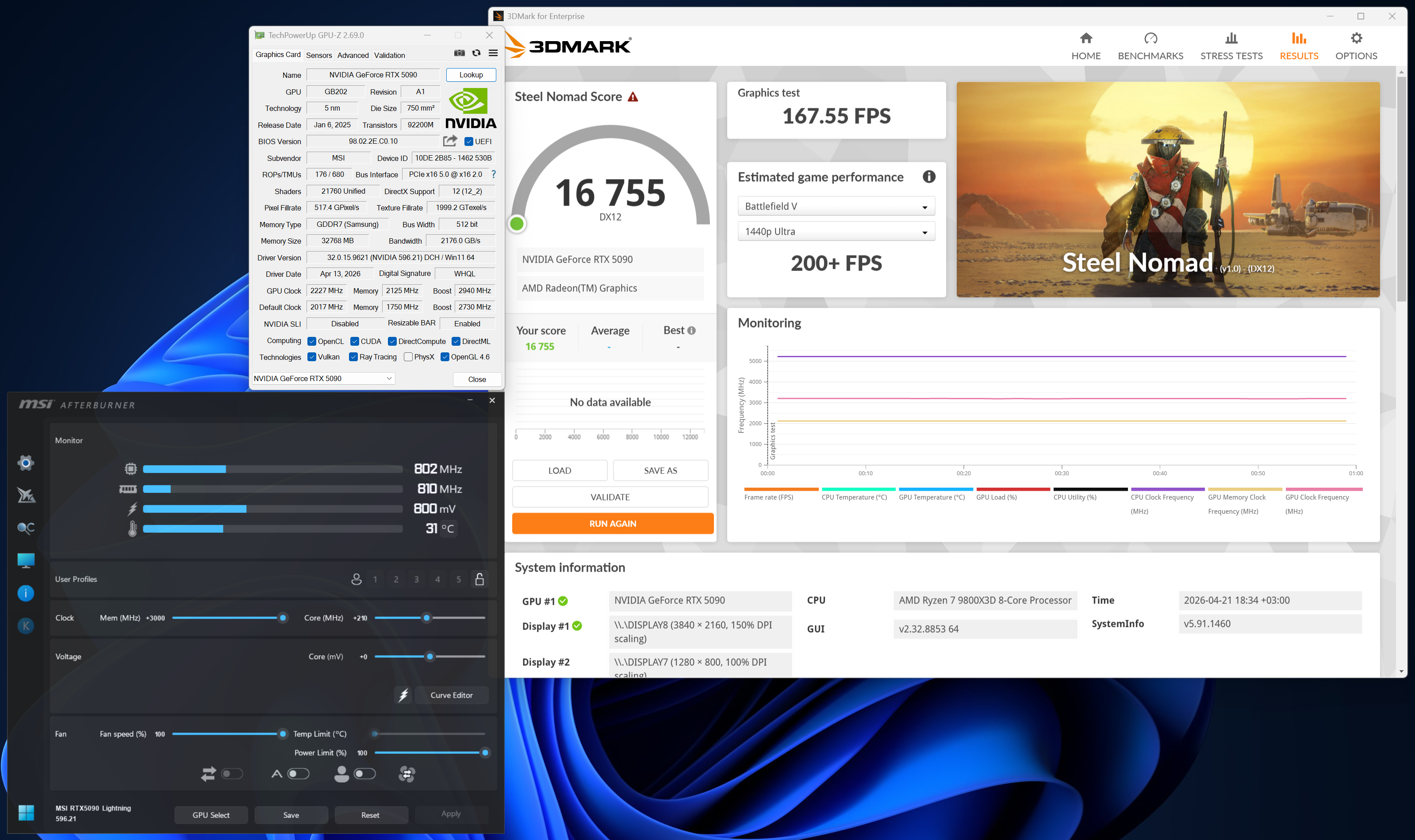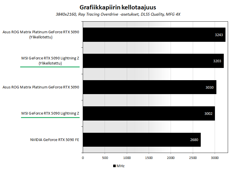 Ylikellotustestissä MSI:n GeForce RTX 5090 Lightning Z oli asennettuna suljetun Corsairin Frame 4000D -kotelon sisälle ja käytössä oli 1000 watin Extreme-tila. Jäähdyttimen tuulettimet asetettiin pyörimään 100 % kierrosnopeudella. Saavutetut kellotaajuudet ovat suuntaa antavia.