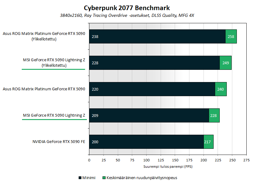 Cyberpunk 2077:ssä Asuksen 5090 Platinum Matrix oli vakiona 5 % suorituskykyisempi kuin MSI:n 5090 Lightning Z, joka puolestaan oli noin 5 % suorituskykyisempi kuin 5090 Founders Edition. Ylikellotettuna 5090 Lightning Z:sta saatiin puristettua irti vielä 9 % parempi suorituskyky, mutta se hävisi Asuksen ylikellotetulle 5090 Matrixille noin 4 % erolla.