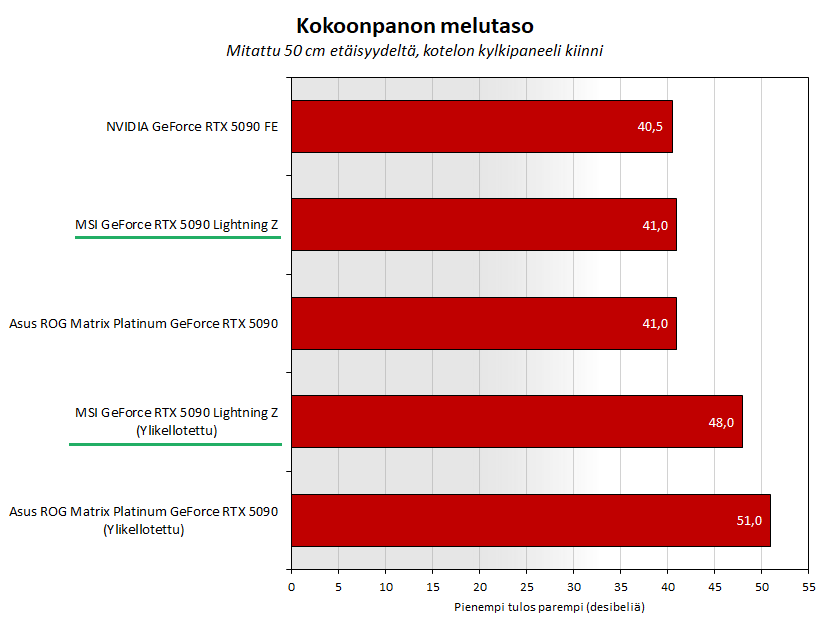 Vakiona MSI:n 5090 Lightning Z 1000 watin Extreme-tilassa ja Asuksen 5090 Matrix Performance-tilassa olivat yhtä äänekkäitä 41 desibelin melutasolla. Melutaso on selvästi kuultavissa, mutta ei kuitenkaan häiritsevän äänekäs.