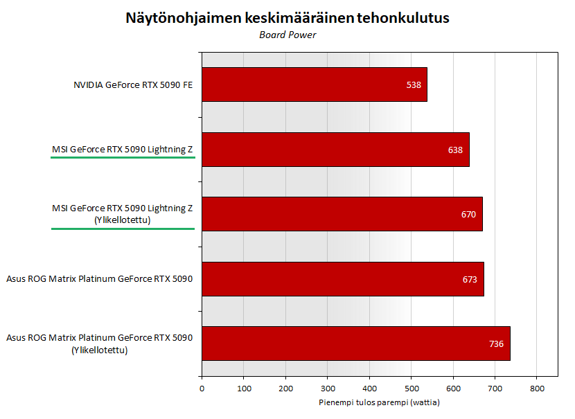 Ylikellotettuna 5090 Lightning Z:n tehonkulutuksen keskiarvo oli 670 wattia ja maksimi käväisi 715 watissa. Asuksen 5090 Matrixilla ylikellotettuna keskiarvo oli 736 wattia ja maksimi käväisi 770 watissa.
