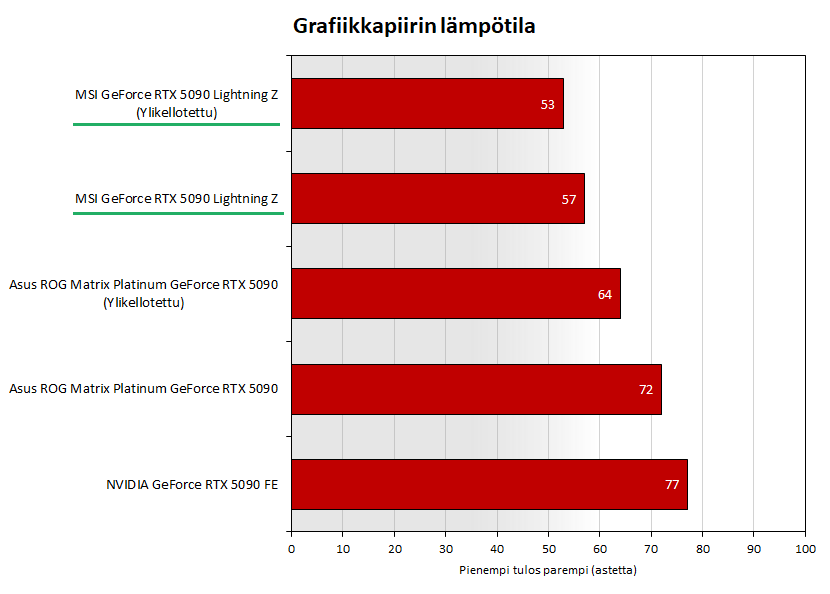 Grafiikkapiirin keskimääräinen lämpötila oli nestejäähdytetyllä 5090 Lightning Z:lla vakiona 57 astetta eli se toimi 15 astetta viileämpänä kuin Asuksen 5090 Matrix ja 20 astetta viileämpänä kuin 5090 Founders Edition.