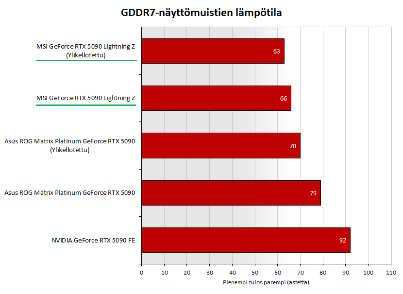 GDDR7-näyttömuistien keskimääräinen lämpötila oli nestejäähdytetyllä 5090 Lightning Z:lla vakiona 66 astetta eli ne toimivat 13 astetta viileämpänä kuin Asuksen 5090 Matrixilla ja jopa 26 astetta viileämpänä kuin 5090 Founders Editionilla.