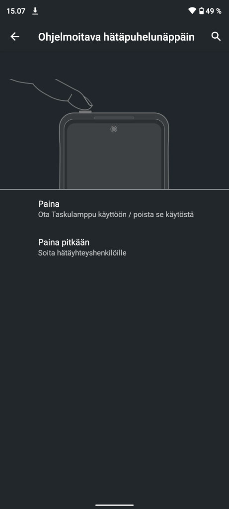 Yläpäädystä XR20:stä löytyy erillinen ohjelmoitava hätäpuhelupainike, jonka käyttötarkoituksen voi kuitenkin valita kohtalaisen vapaasti asetuksista, eli hätäpuheluita varten sitä ei tarvitse pitää. Allekirjoittanut esimerkiksi piti sitä taskulampun pikapainikkeena, jolloin valon sai päälle avaamatta näyttöä. Toinen mahdollinen käyttökohde voisi olla pitää painike virtapainikkeena, sillä virtapainikkeen sormenjälkilukija toimi ainakin testijaksolla hieman yli-innokkaasti usein avaten puhelimen välittömästä sen lukitsemisen jälkeen, jos sormea piti edes hieman näpäytystä pidempään painikkeen päällä. Muilta osin sormenjälkilukija toimi hyvin.
