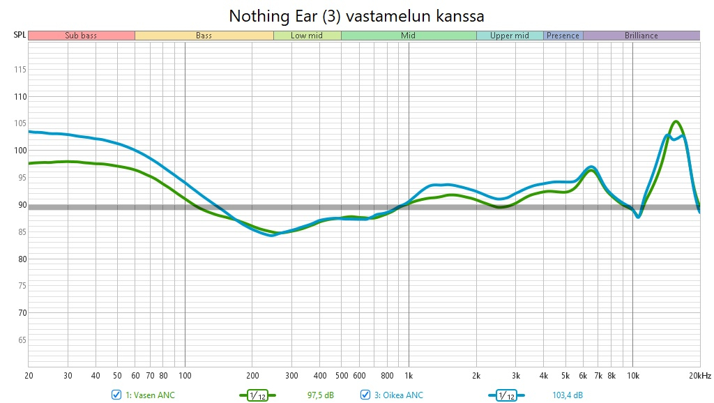 Kuten taajuusvastekuvaajista on nähtävissä, on Nothing Ear (3):n taajuusvaste hyvin voimakkaasti V:n muotoinen. Erityisesti tämä korostuu vastamelun kanssa, jolloin alempiin keskitaajuuksiin syntyy jopa pieni kuoppa, joka korostaa basson määrää entisestään. Äänessä on omaan makuuni jopa naurettavan paljon bassoa ja musiikissa huomio kiinnittyy todella voimakkaasti alataajuuksiin. Basso on sinänsä hyvällä alueella korostuksen osalta, mutta sitä on niin paljon, että äänestä tulee helposti musiikista riippuen myös kumisevaa.