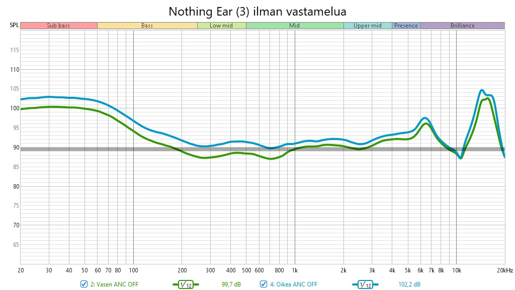 Kuten taajuusvastekuvaajista on nähtävissä, on Nothing Ear (3):n taajuusvaste hyvin voimakkaasti V:n muotoinen. Erityisesti tämä korostuu vastamelun kanssa, jolloin alempiin keskitaajuuksiin syntyy jopa pieni kuoppa, joka korostaa basson määrää entisestään. Äänessä on omaan makuuni jopa naurettavan paljon bassoa ja musiikissa huomio kiinnittyy todella voimakkaasti alataajuuksiin. Basso on sinänsä hyvällä alueella korostuksen osalta, mutta sitä on niin paljon, että äänestä tulee helposti musiikista riippuen myös kumisevaa.