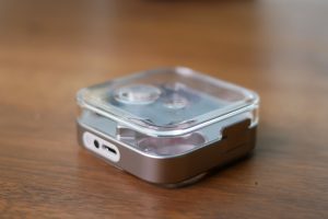 Latauskotelo itsessään on edelleen nykymarkkinoille kohtalaisen kookas ja ulkomitat ovat käytännössä tutut viime vuodelta, vaikka paperilla eroa joitain millinkymmenyksiä onkin. Kotelo on kuitenkin riittävän ohut, jotta se sujahtaa kohtalaisen hyvin taskuun. Edellismallin koteloon verrattuna uutukaiseen lisätty metalliosa tarjoaa jonkin verran laadukkaamman yleistuntuman. Nothing tarjoaa IP54-sertifikaatin kuulokkeiden lisäksi myös kotelolle, eli vesisadetta ei tarvitse säikähtää, vaikka kotelo olisi taskussa.