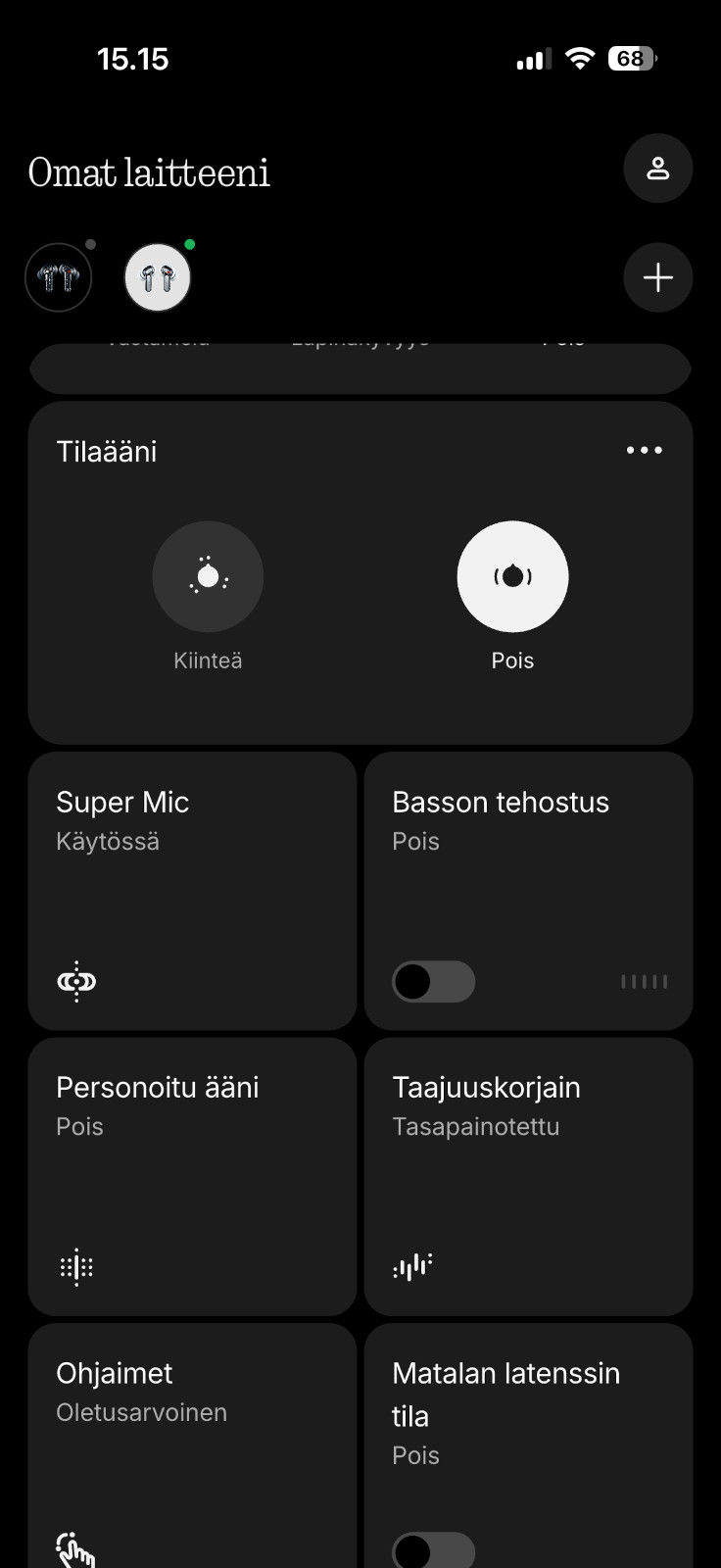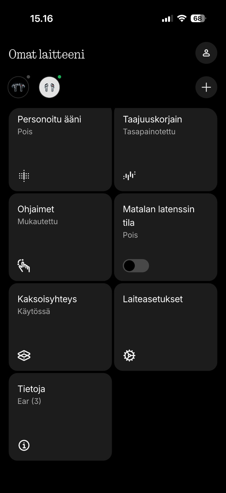 Viime vuoden Earit erottuivat markkinoilta edukseen todella kätevällä tavalla tehdä kuulokkeista neutraalimmat – niiden bassokorostus tuli sovelluksen bassolisä-asetuksesta, joka oli vakiona päällä ja sen poistamalla kuulokkeet soivat luokassaan hyvin tasapainoisesti, joskin omaan makuuni yläpäältään hieman latteasti. Tänä vuonna bassolisäasetus on kuitenkin vakiona pois päältä ja Ear (3):n jättimäinen bassokorostus on osa kuulokkeiden perusäänimaisemaa. Sen myötä siitä takaisin neutraaliin palaaminen vaatiikin taajuuskorjaimen kanssa säätämistä, mikä on väistämättä merkittävä miinus viime vuoden ratkaisuun nähden.
