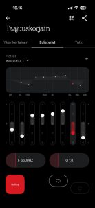 Jo edellismallissa oli suoraan paketista selvä bassokorostus, mutta siitä pääsi eroon ottamalla bassolisän sovelluksen napista pois päältä. Uutukaisissa bassokorostus on osa vakiotaajuusvastetta, eli bassokorostusnapin sijaan sen pois leikkaaminen vaatii taajuuskorjaimen käyttöä, mikä on harmillisesti entistä työläämpi ratkaisu. Positiivisena puolena kuulokkeet tottelevat taajuuskorjainta edelleen hyvin ja rauta vaikuttaisi kykenevän toistamaan ääntä neutraalimminkin, joten bassokorostuksen voi korjata hillitymmäksi. Nothing X:n parametrinen taajuuskorjain itsessään on kuitenkin edelleen yksi kuulokkeiden selvimpiä myyntivaltteja – sen kanssa äänestä saa todennäköisesti tehtyä lähes kaikkiin makuihin sopivan, minkä lisäksi sovellus tukee taajuuskorjausten jakamista valmistajan Playground-alustalla.