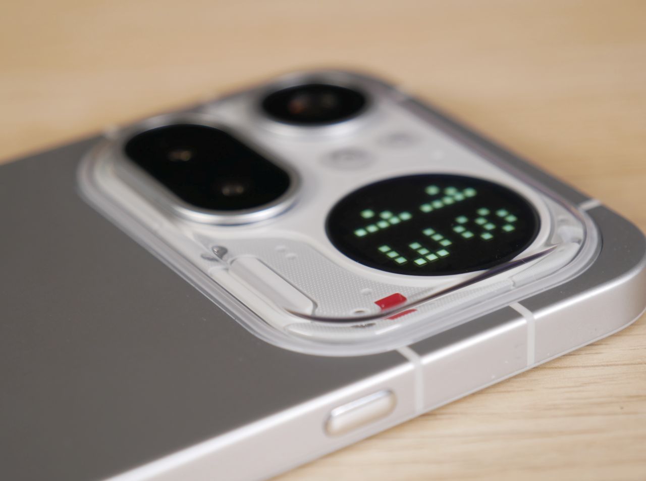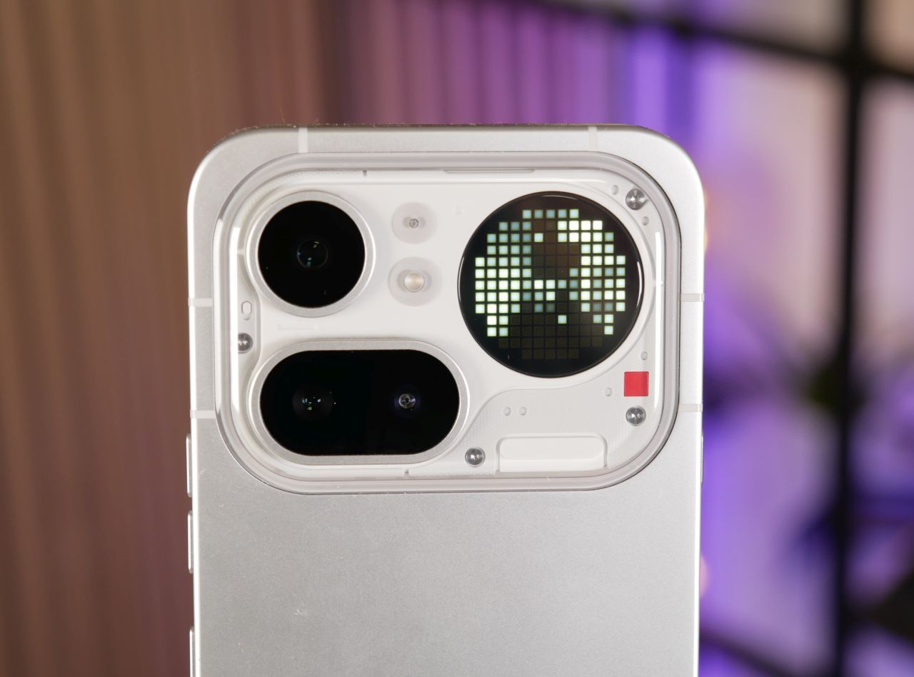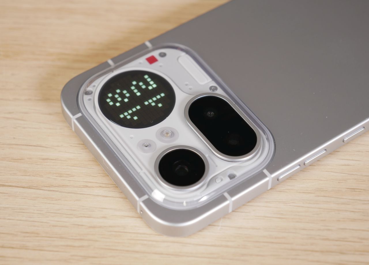 Edeltäjämallin tapaan takakuoren yläosan kamerasaareke on melkoinen katseenvangitsija, vaikka design on muuttunut varsin merkittävästi. Saarekkeen sijainti on symmetrinen, joten puhelin ei pääse keinumaan pöydällä juurikaan. Kamerat, salama ja mikrofoni sijaitsevat kohouman vasemmassa puoliskossa ja Glyph Matrix -näyttö oikeassa reunassa. Kohouman läpinäkyvä osa on muovia, joten sen kestävyys ja etenkin naarmuuntumisherkkyys pidemmällä aikajänteellä on kysymysmerkki. Maininnan arvoisena yksityiskohtana Glyph Matrix -näytön alapuolella sijaitseva punainen pieni neliö toimii videokuvatessa punaisena merkkivalona, joka kertoo kuvaamisen olevan käynnissä.