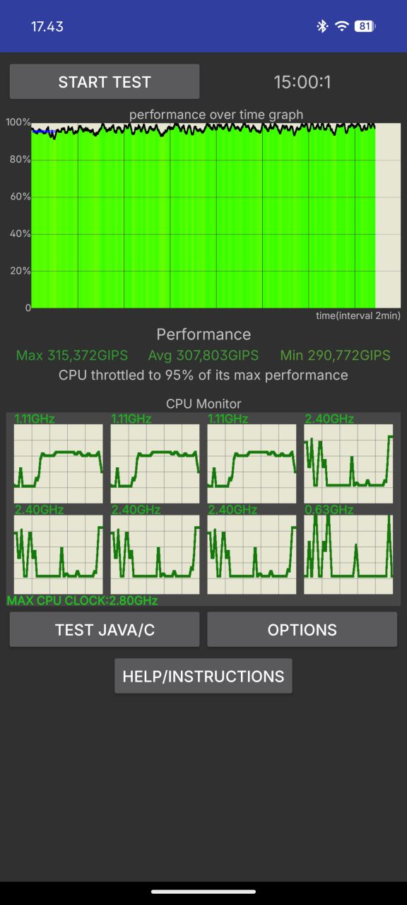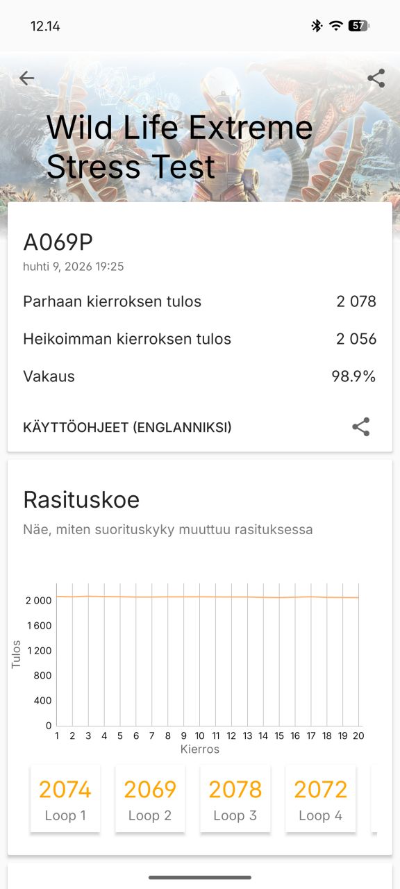 Pitkäkestoista rasitusta testaavista testeistä CPU Throttling -prosessorirasitustestissä suorituskyky laski vain hyvin vähän noin 95 %:iin maksimista ja raskasta grafiikkarasitusta simuloivassa 3DMark Wild Life Extreme Stress Testissä suorituskyky laski 20 minuutin aikana noin 99 %:iin maksimista, eli pysyi käytännössä täysin vakaana. Lukemat ovat varsin tyypillisiä keskihintaluokan puhelimelle ja piirille, jonka lämmöntuotto ei ole vielä erityisen suurta.