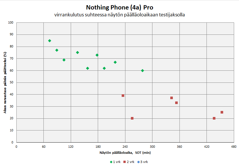 Phone 4a Pron akunkesto oli testijaksolla hyvää keskiluokkaa edustavalla tasolla ja pitkälti samaa luokkaa edeltäjämallin kanssa. Puhelimella selvittiin toistuvasti yhdellä latauksella kahden päivän yli, kun näytön päällä oloaika liikkui päivää kohden noin 2-3 tunnissa. Kolmen päivän ylitystä ei yritetty, vaikka se olisi todennäköisesti kevyemmällä käytöllä kyllä onnistunut. Laskennallinen maksimi näytön päälläoloaika yhden päivän puitteissa oli testijakson käyttökokemusten pohjalta noin 8-9 tuntia.