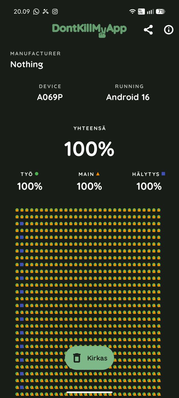 Dontkillmyapp-testistä Phone 4a Pro sai täyden 100 % tuloksen, eli laitteen käyttöjärjestelmässä ei ole asiaankuulumattomia sovellusten taustatoimintaa rajoittavia ominaisuuksia. Esimerkiksi Googlen Pixel-puhelimet kykenevät samaan ”puhtaaseen” suoritukseen, mutta monen muun valmistajan käyttöjärjestelmätoteutukset eivät. Nothing OS on siis tässä asiassa harvojen ”hyvisten” joukossa.