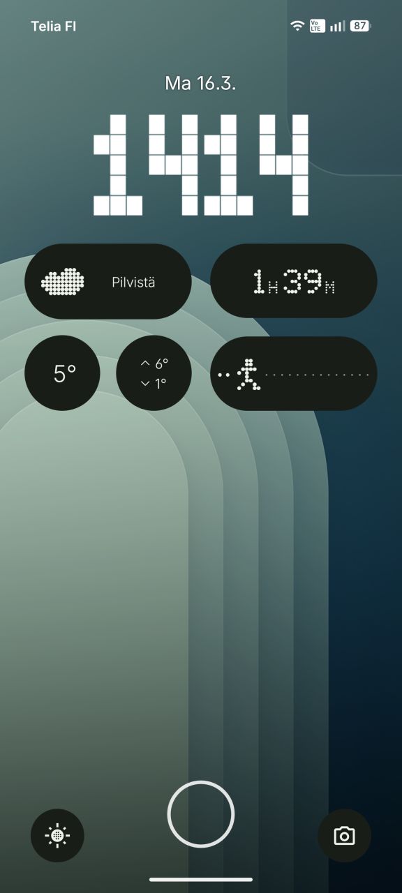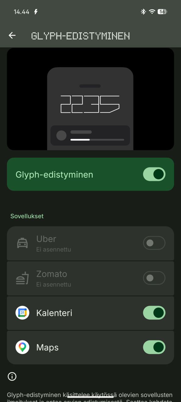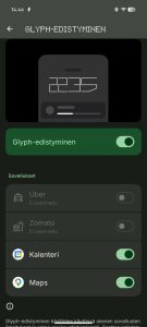 Ehkäpä Glyph Matrixin hyödyllisin anti on ilmoitusten näyttäminen, eli käyttäjä voi määritellä sääntöjä (kuka kontakti, mikä sovellus, mikä toiminto) joiden pohjalta näyttöön ilmestyy haluttu ilmoituskuvake. Kuvakkeita voi valita valmiista vaihtoehdoista tai luoda itse valokuvien pohjalta. Näyttöön on myös mahdollista aktivoida ”aina päällä oleva Glyph-lelu”, eli käytännössä widgetti joka näkyy näytöllä kun puhelin on asetettu pöydälle alassuin. Itse käytin näytöllä kello-widgettiä, joka tosin vaikutti aktivoituvan myös silloin, kun puhelimen otti käteen. Akunkestoon se ei tuntunut juurikaan vaikuttavan.