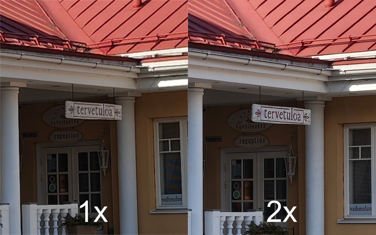 Kuvausnäkymässä on tarjolla suora 2x-tila, joka toteutetaan käytännössä pääkameran sensorilta. Ottamiemme testikuvien perusteella sen tuottama jälki on yksityiskohtaisempaa kuin 1x-tilassa otetuissa kuvissa, mutta paikoin kuvista tulee hieman erikoisen utuisia.