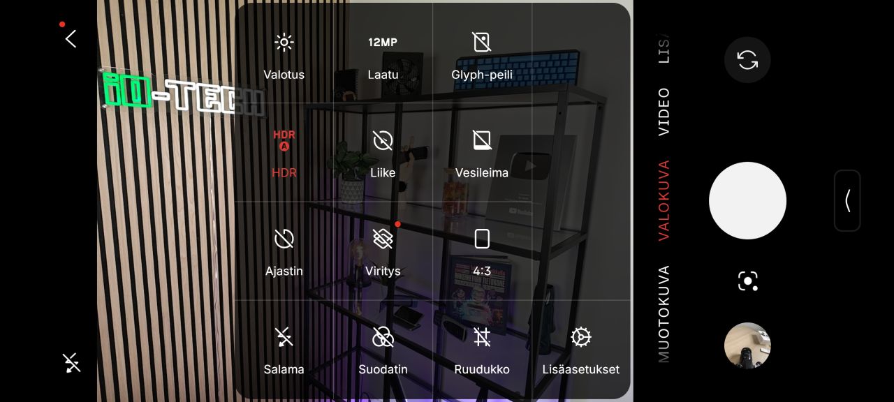 Takakuoren Glyph Matrix -näyttöä voi hyödyntää myös valokuvauksessa parilla eri tavalla. Ajastimella valokuvia ottaessa näyttö kertoo jäljellä olevan ajan. Takakameraa voi myös hyödyntää laadukkaampien selfie-kuvien ottamiseen Glyph-peili ominaisuuden avulla, joka luo matriisinäytölle karkean hahmon kuvauksen kohteesta asemoinnin ja sijoittelun helpottamiseksi. Vaikka Glyph Matrix voi olla melko kirkas, en ainakaan itse löytänyt mahdollisuutta käyttää sitä kuvaamisen apuvalona, joka on harmi.