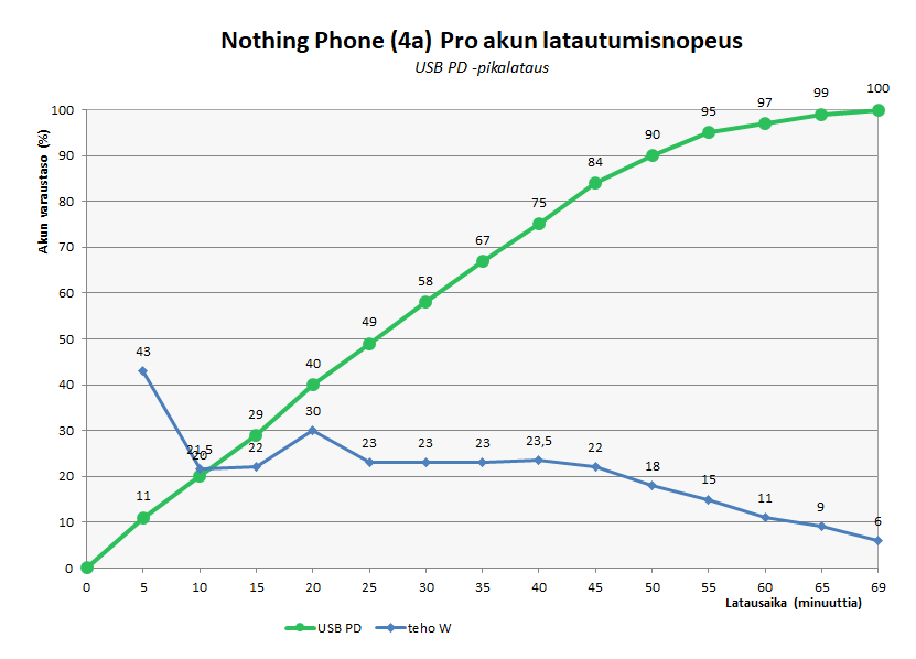 Testeissämme lataaminen tyhjästä täyteen otti tunnin ja yhdeksän minuuttia. Ensimmäisen vartin aikana tyhjään akkuun latautui 29 % ja puolessa tunnissa 58 %. Aivan alussa latausteho piipahti korkeimmillaan 43 watissa, mutta suurimman osan ajasta se pysytteli noin 25 watin tietämillä, eli ilmoitettua 50 watin maksimitehoa ei käytetä juuri lainkaan.