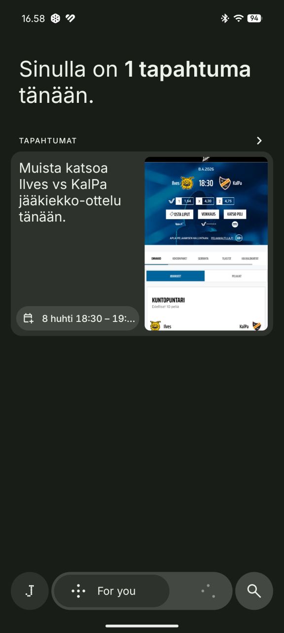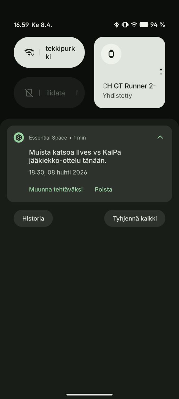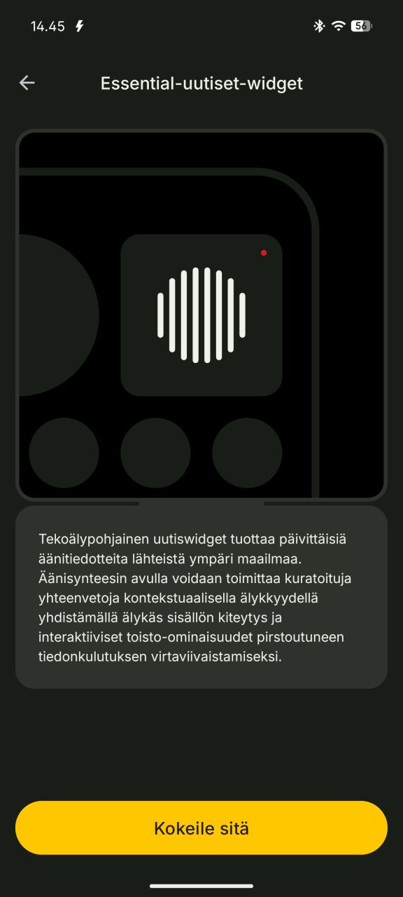 Essential uutiset -ominaisuus on kotinäkymään lisättävä widget, joka kuratoi käyttäjälle haluttujen aihepiirien uutisia ja koostaa niistä tekoälyn avulla äänipohjaisen uutisraportin, jonka voi käynnistää yksinkertaisesti widgettiä painamalla. Ajatus on hauska ja vaikutti muutaman kokeilukerran perusteella toimivalta ja miellyttävältä, mutta suomalaisen käyttäjän näkökulmasta miinuksena on suomenkielen ja paikallisten uutisaiheiden puuttuminen.