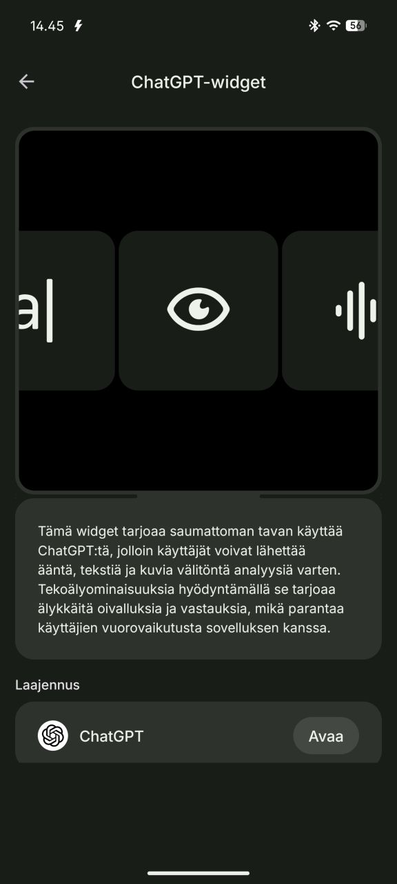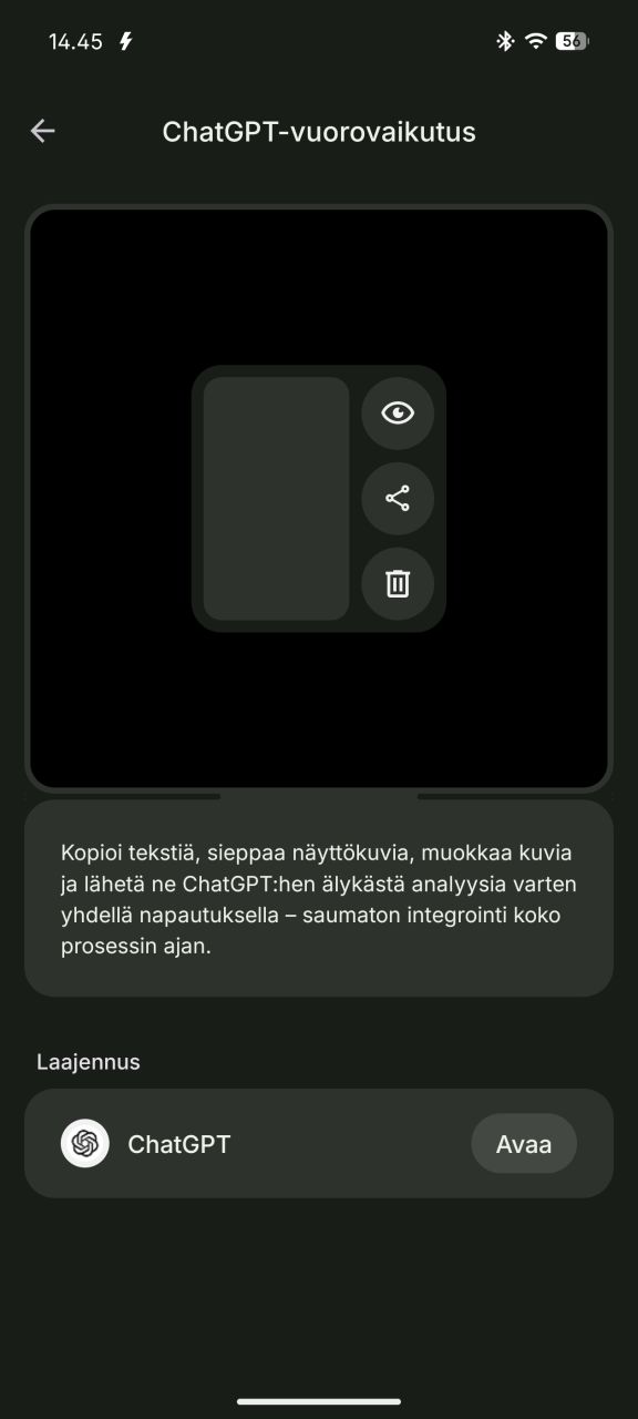 Nothing OS 4:ssä uutta on ChatGPT integrointi mm. asialle pyhitetyssä widgetissä ja kuvankaappaustyökalussa. Molemmat vaativat ChatGPT-sovelluksen asentamisen puhelimeen sekä täyden hyödyn ulosmittaamiseksi myös maksullisen ChatGPT-tilauksen.