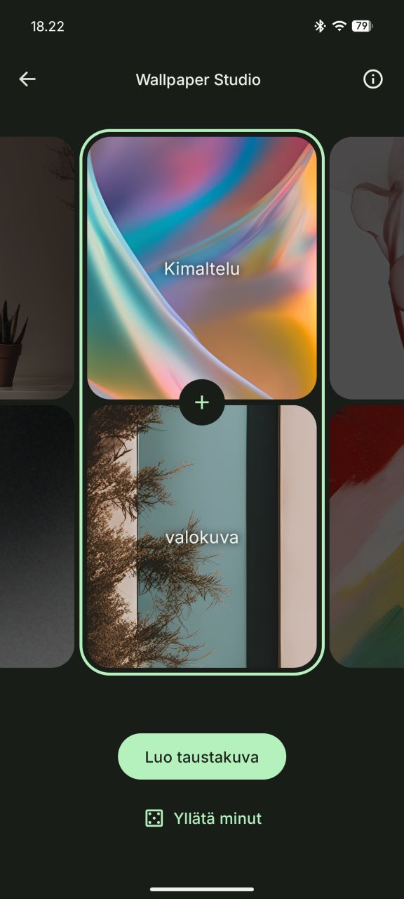 Wallpaper Studio on nimensä mukaisesti taustakuvien tekoälyavusteinen luontityökalu, joka luo abstrakteja taustakuvia kahden muutamasta vaihtoehdosta valittavan parametrin mukaan. Ominaisuus on integroitu tarjolle koti- ja lukitusnäkymän mukauttamisasetusten yhteyteen.