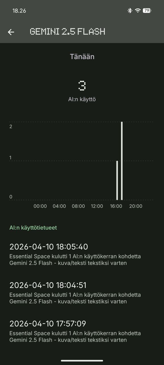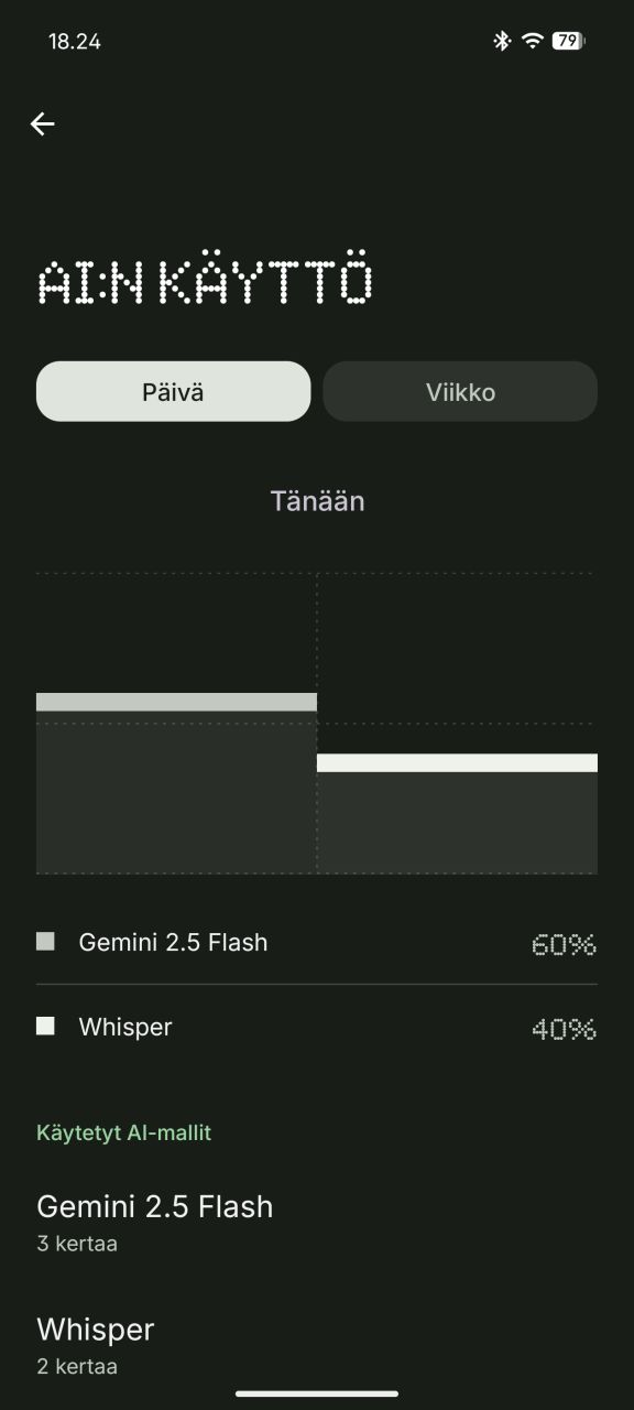 Uusi AI:n käyttö -ominaisuus tarjoaa käyttäjälle mahdollisuuden seurata kaikkea puhelimella käytettävien AI-mallien käyttöä. Se erottelee päivä ja viikkotasolla jakauman käytettyjen mallien välillä sekä yksittäiset käyttökerrat ja missä yhteydessä sitä hyödynnettiin.