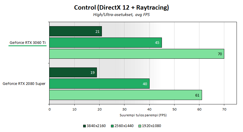 Controlissa säteenseuranta päällä RTX 3060 Ti oli resoluutiosta riippuen 10-15 % suorituskykyisempi kuin 2080 Super.