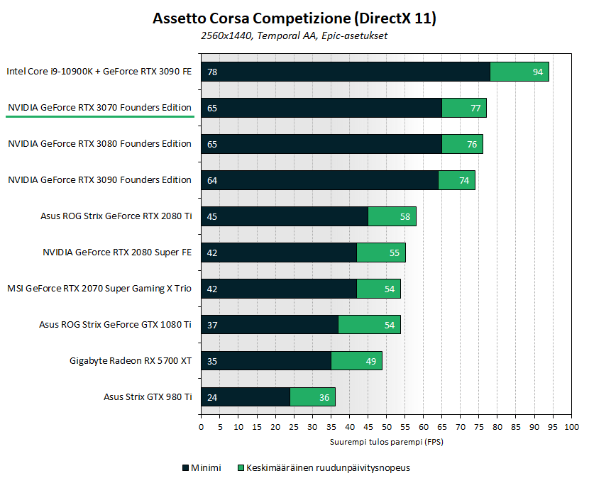 Valitettavasti meiltä ei io-techin testilaboratoriosta löydy 2080 Ti:stä NVIDIAn omaa Founders Edition -mallia, vaan ajoimme testitulokset yhdellä markkinoiden suorituskykyisimmistä 2080 Ti -malleista eli Asuksen tehdasylikellotetulla Strix 2080 Ti:llä. Siitä huolimatta 3070 Founders Edition pysytteli hyvin Strix 2080 Ti:n kannoilla ja jäi 4k-resoluutiolla noin 10 % ja 1440p-resoluutiolla noin 5 % jälkeen. Joissain peleissä, kuten Doomissa ja Controlissa sekä prosessoririippuvaisissa Flight Simulatorissa ja Assetto Corsa Competizionessa tilanne oli tasan, mutta harvemmin kuitenkaan 3070:n eduksi. Founders Editionien kesken kamppailu olisi todennäköisesti hyvin tasainen. Edellisen sukupolven ja samanhintaiseen 2070 Superiin verrattuna RTX 3070 tarjoaa keskimäärin noin 30 % ja parhaimmillaan 40-50 % parannuksen.